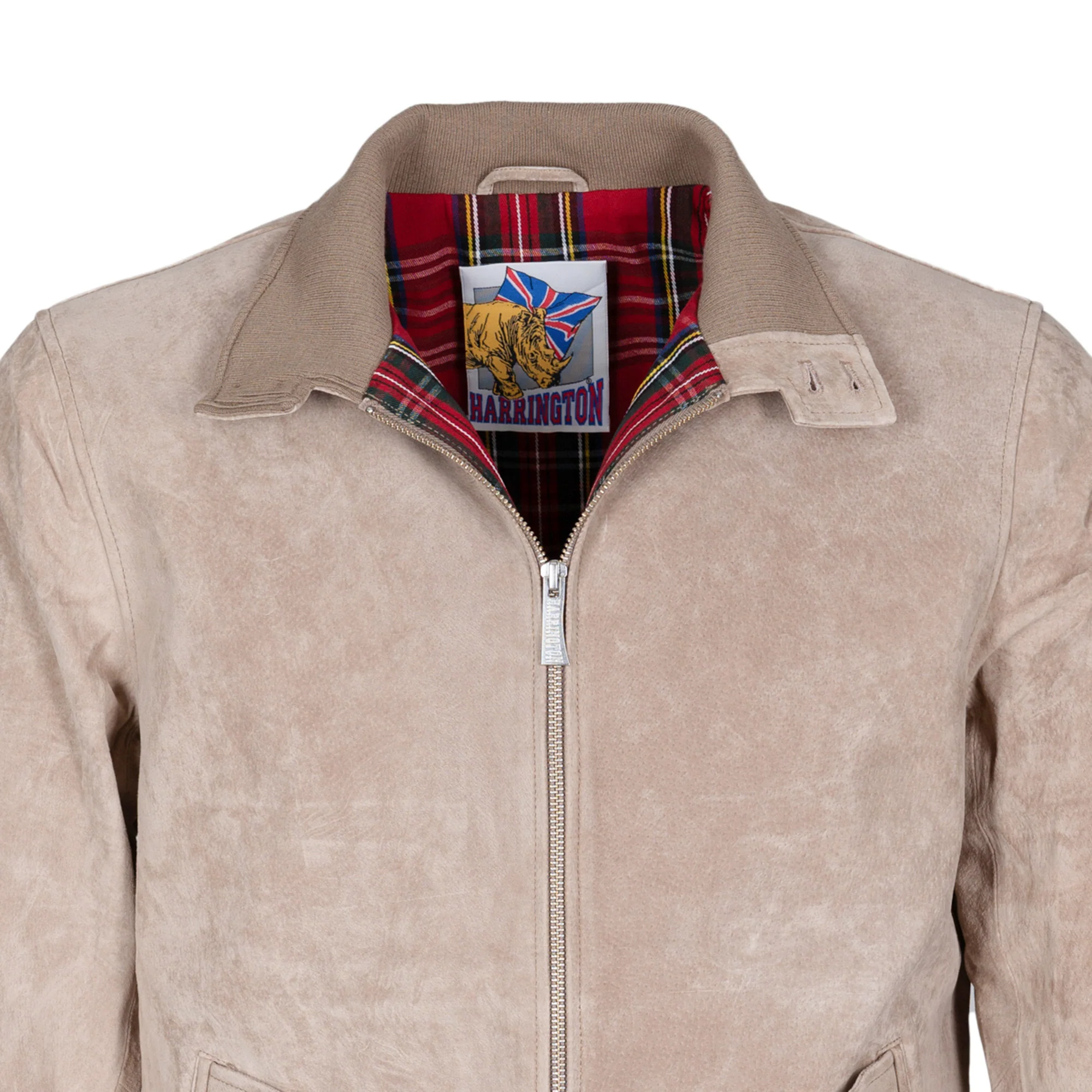 - Blouson en daim beige intérieur doublé en Tartan Royal Stewart rouge