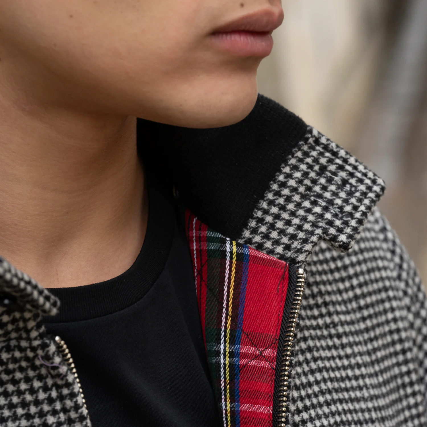- Casual et élégant, le blouson court zippé motif pied de poule, un indispensable de la saison.